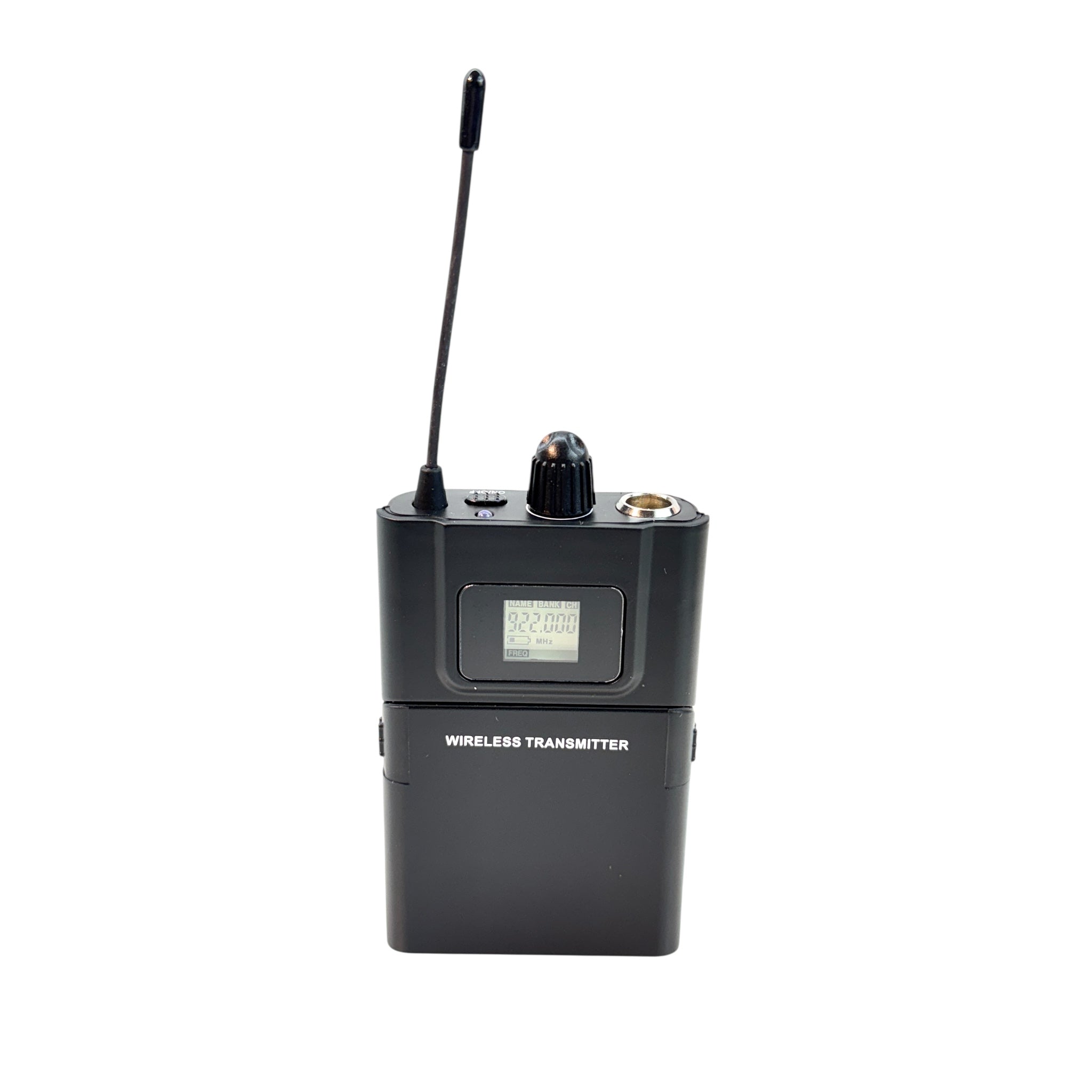 Beltpack style transmitter with volume control. The A2 transmitter is powered with 2(AA) batteries. The setup includes the Evno Ta4 (3pin-4pin) mini xlr cable which connects the microphone to the A2 transmitter. The transmitter receives channel changes via the IR sync window controlled by the receiver.