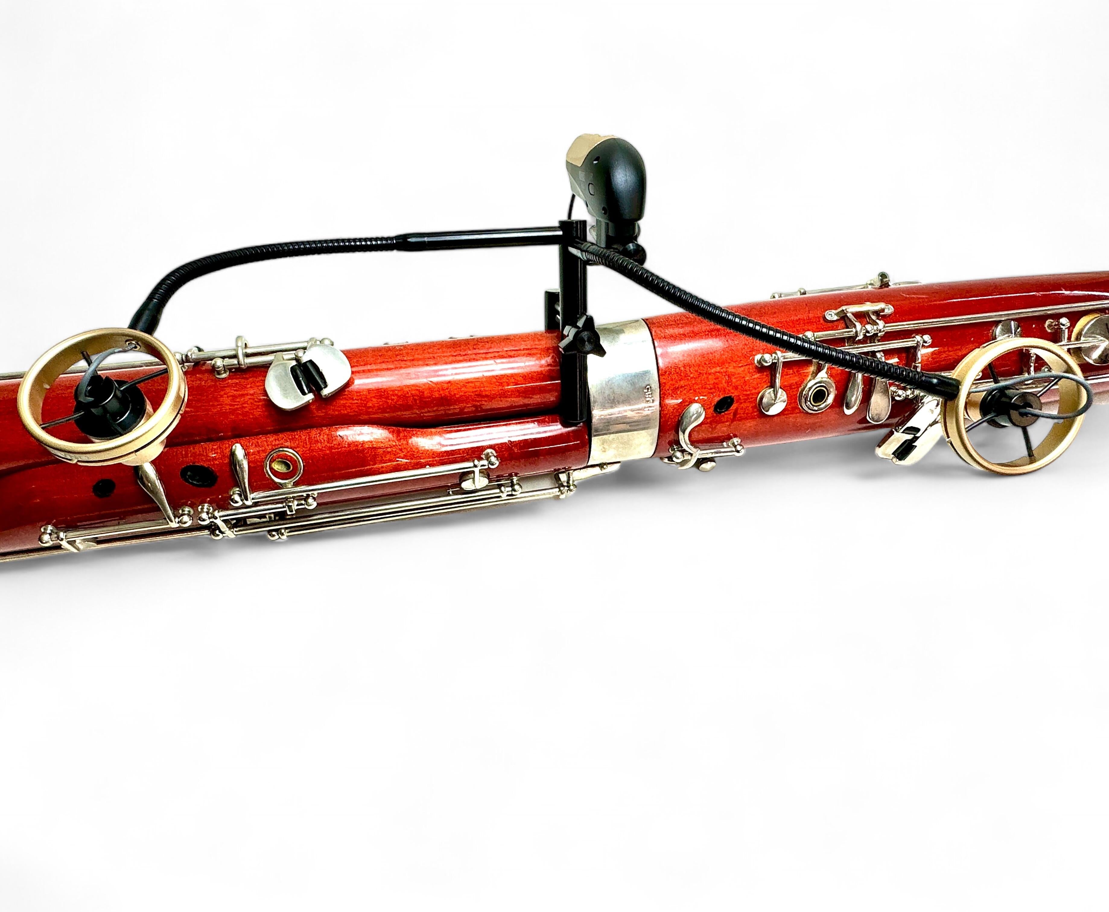 The BSX2 clamps to the side of the bassoon allowing the goosenecks to be position over the most crucial areas of the instrument as needed.