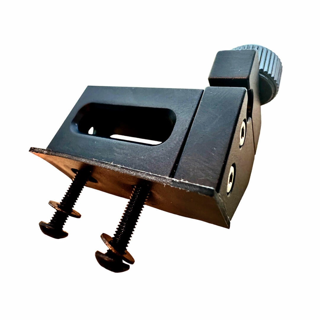 The Evno designed clamp is mounted to the grill of an accordion with several options. The preferred option is by placing two screws through any preexisting holes in the grill. A small hole through the grill cloth maybe necessary. The included screws are small and will screw into the bottom of the clamp while the screw and washer hold the clamp onto the grill from the inside of the accordion. The clamp can be left on the grill after removing the microphone for quick setups in the future. The placement of the clamp would be selected by preference or where openings in the grill would allow attachment. If the grill doesn’t have a useable hole for two screws, an optional velcro strap is included to feed into the grill and back around to the clamp for attachment. Openings on the grill will be needed for this mounting system and it maybe required to cut the grill cloth again for an opening.