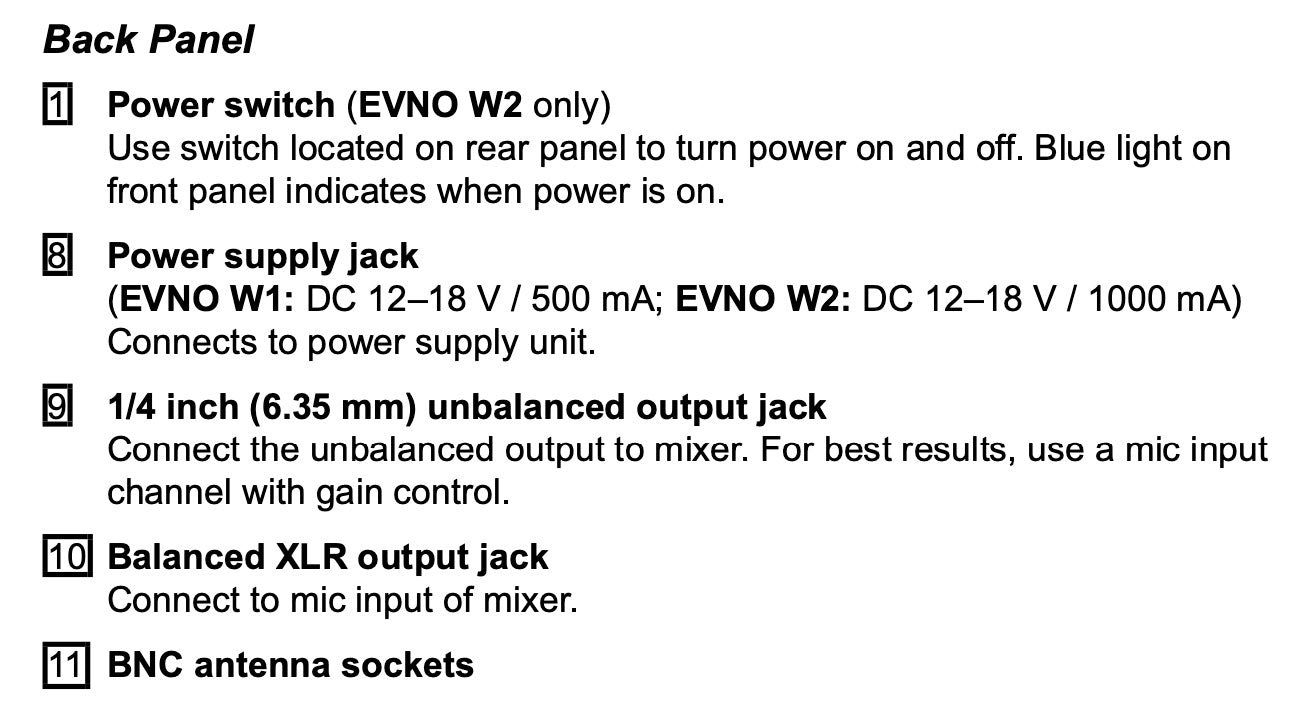 The Evno W2 dual wireless operates two separate antennas, one for each side of the receiver / microphone / transmitter. The W2 is housed in a metal chassis with 2-XLR and 1-1/4in output which mirrors side in the case where you need a 1/4in output. A 1/2 rack-mountable design, the system come with a rack-kit and extension cables to place in a standard rack unit. The extension kit places the antennas on the front of the of the rack case allowing quick removal of the antennas for storage. The antennas disconnect with an BNC locking connector to either the back or front when racked.
